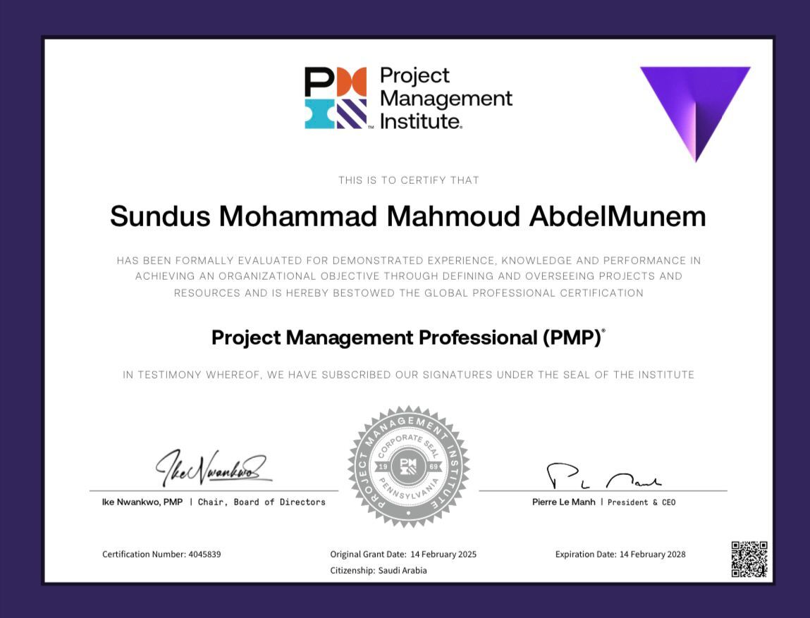 ﺣﺼﻮﻟﻬــﺎ ﻋﻠــﻰ ﺷﻬـــﺎدة إدارة اﻟﻤﺸﺎرﻳــــﻊ